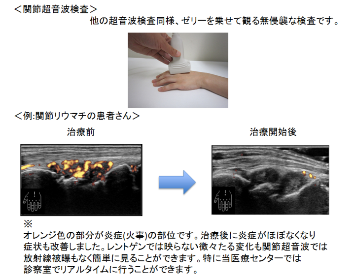その中でも関節リウマチに対する関節超音波検査には力を入れており、外来診察室に関節超音波検査装置を常備し、リアルタイムでの診断、疾患活動性評価、治療効果判定を 行っております。触診だけでは判らない微々たる炎症も関節超音波では検知することができ関節破壊抑制を達成すべく治療コントロールをしております。